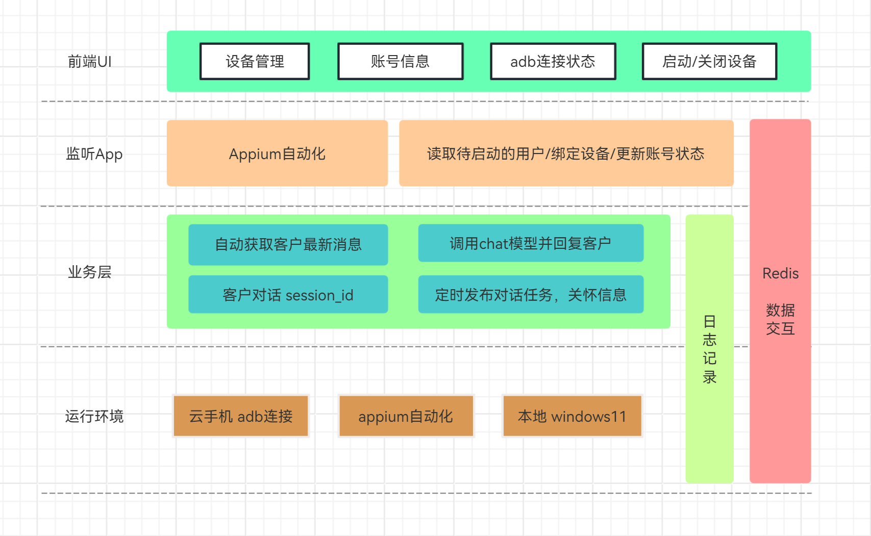 appium群控框架 业务框架实现流程 前端页面管理设备/维护张账号/设备信息 通过FastAPI框架/Redis数据库进行数据交互 通过Appium框架进行设备的操作 通过chatgpt模型进行对话的生成/自动回复